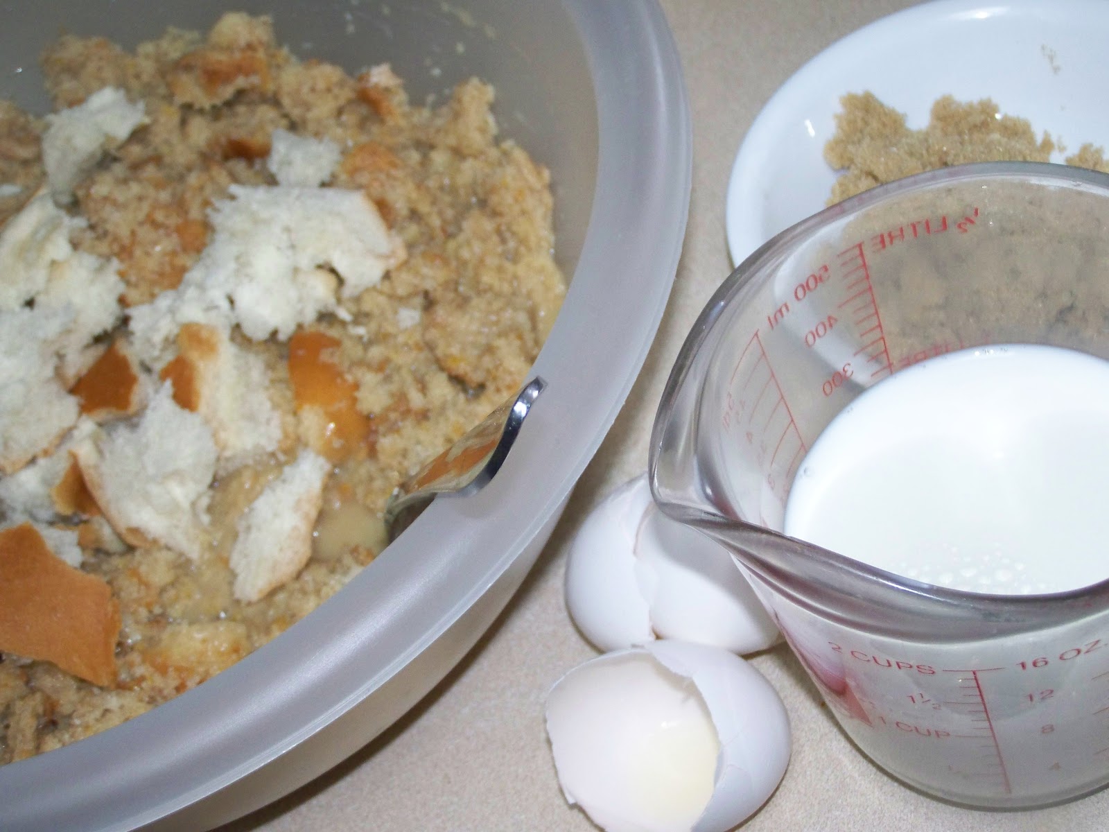 | We looked around the kitchen and decided to throw together a few ingredients to make a bread pudding. 1)We mixed 3 eggs, 2 cups of milk, 1 1/2 cups of brown sugar, a splash of vanilla and some cinnamon. 2)Then we added a mix of stale bread we had sitting around. Approximately a half a loaf worth of french bread and some old dry hot dog buns. |