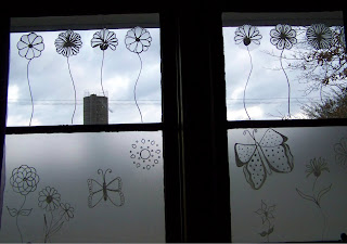 All you will need to purchase to complete this project is a white Elmer's Painters marker, clear Con-Tact brand adhesive liner (it says clear but it actually looks frosted), masking tape (if desired), and Windex glass cleaner (or other brand).