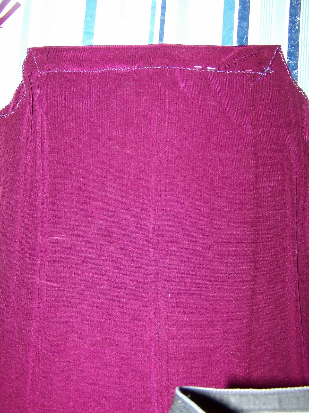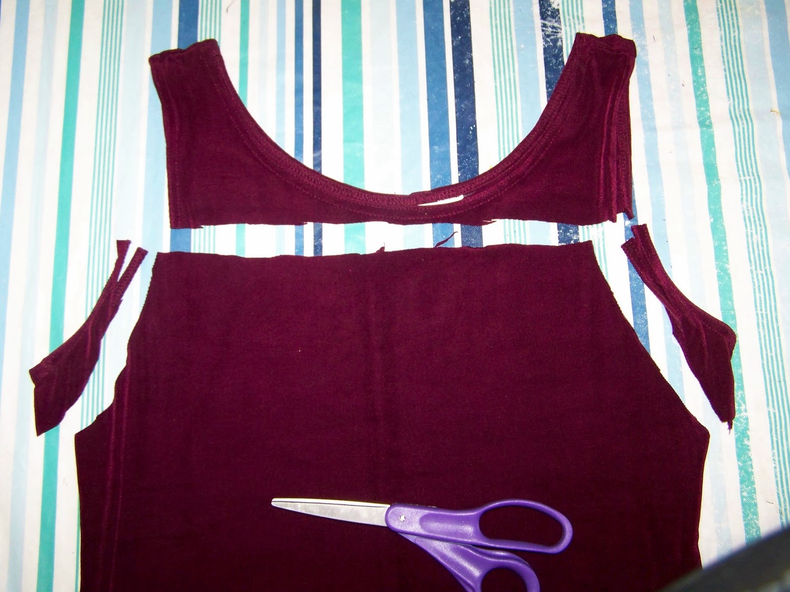 | I stitched around the armholes to prevent raveling and made a 1 inch seam at the top to thread the neck tie through. |