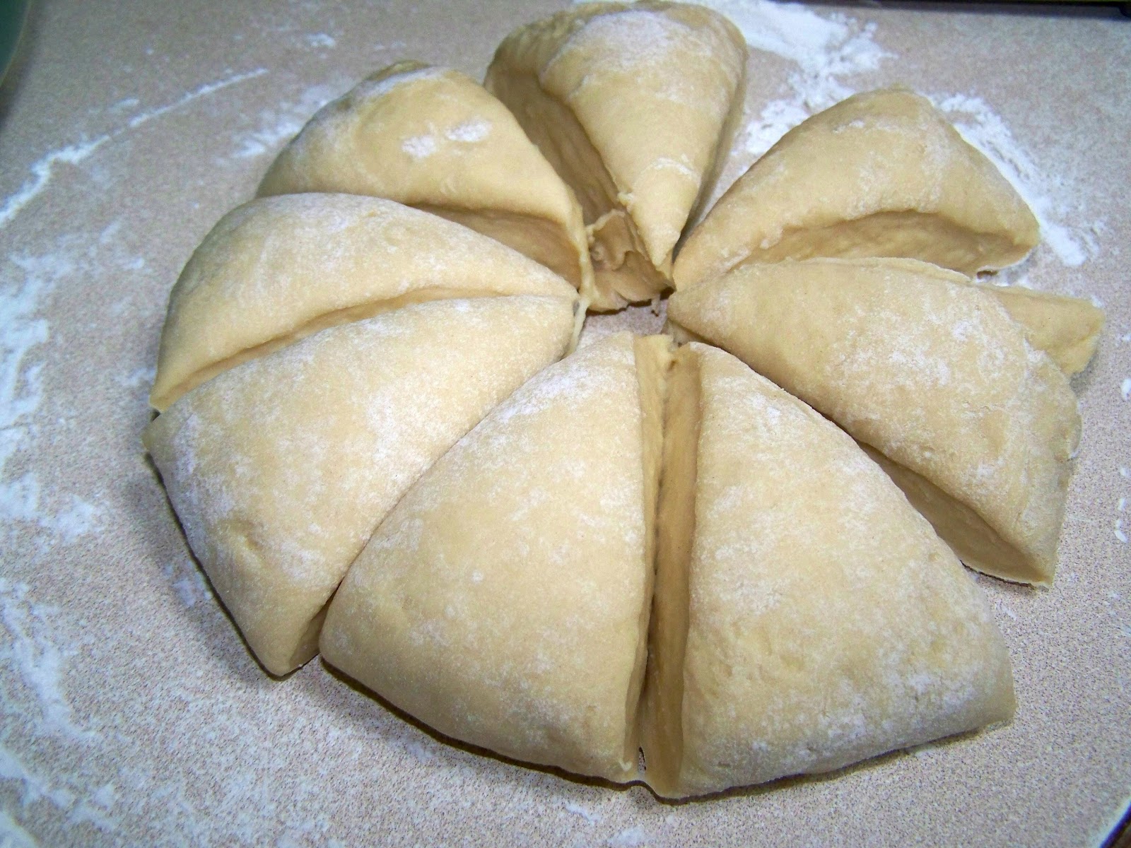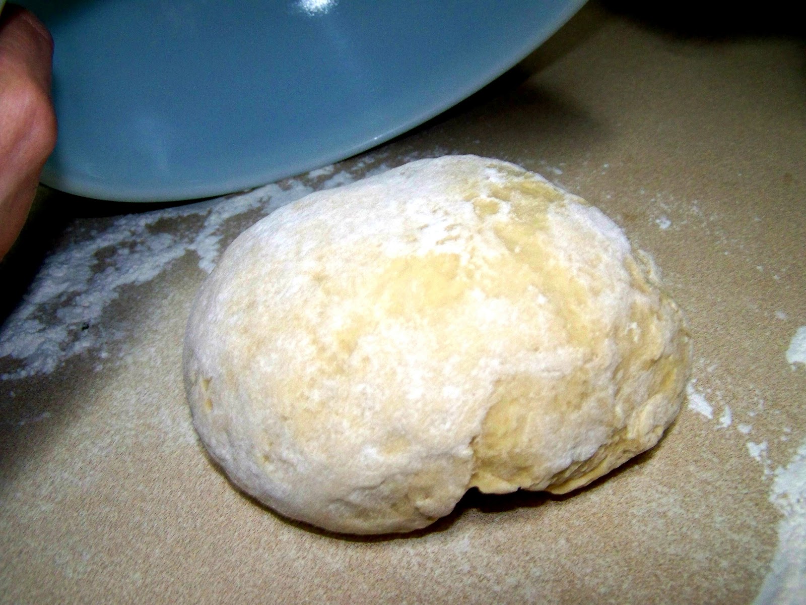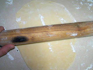 | 6) Roll dough sections out to desired thickness. I prefer a thickness of about 1/8th inch. |