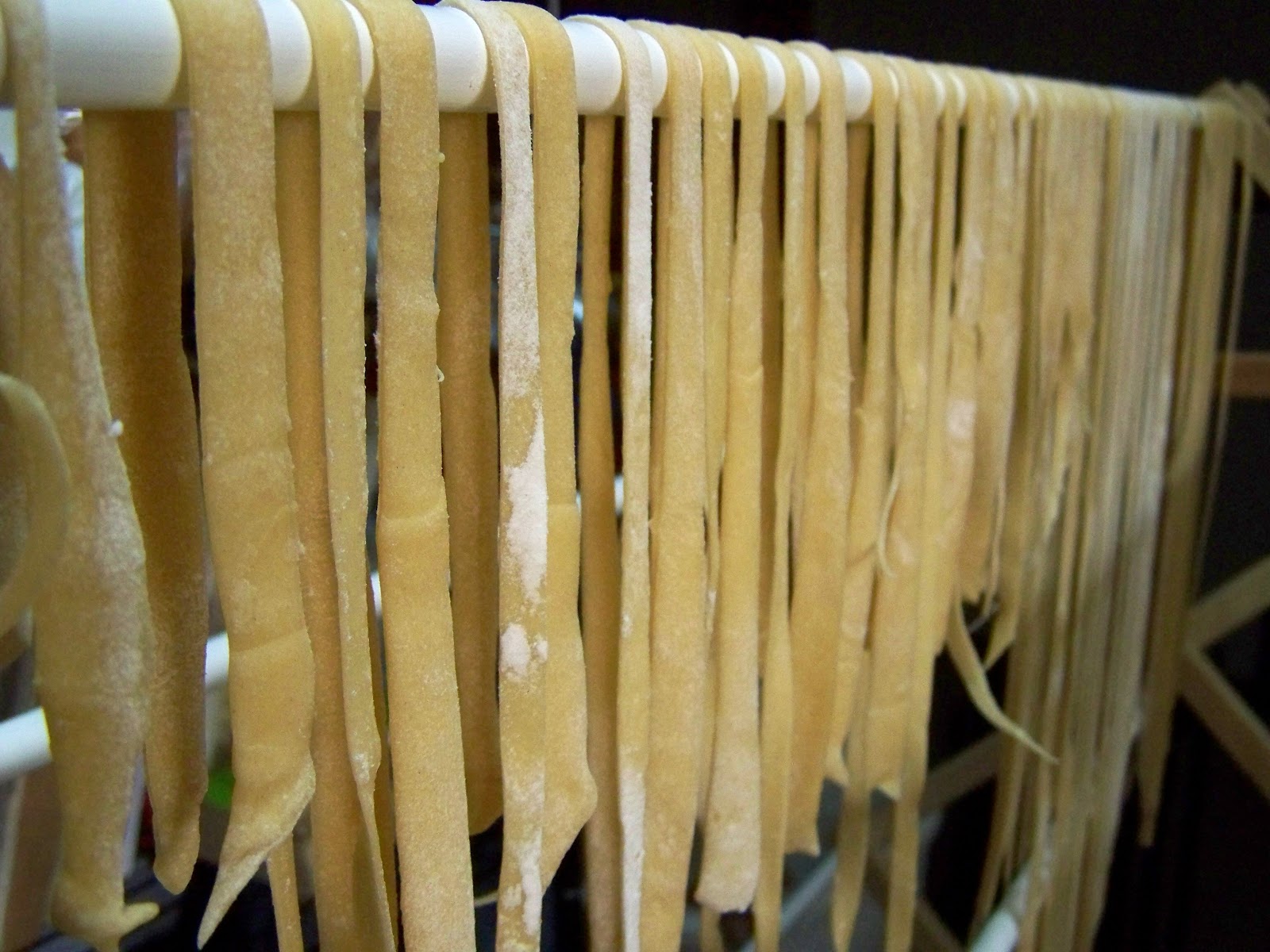| 9) Hang noodles to dry. I use a clothes dryer as a pasta rack but you can use whatever you have. If you have nothing to hang your noodles on, you can lay them out on a floured cloth to dry. |