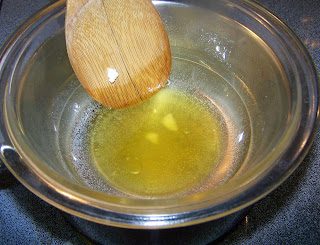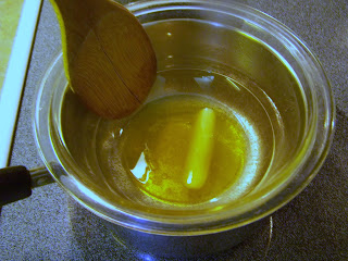| Stir gently as the cocoa butter melts. Be careful to not let the butter get too hot. It should never smoke or spatter. Mine didn't even look steamy. |