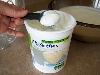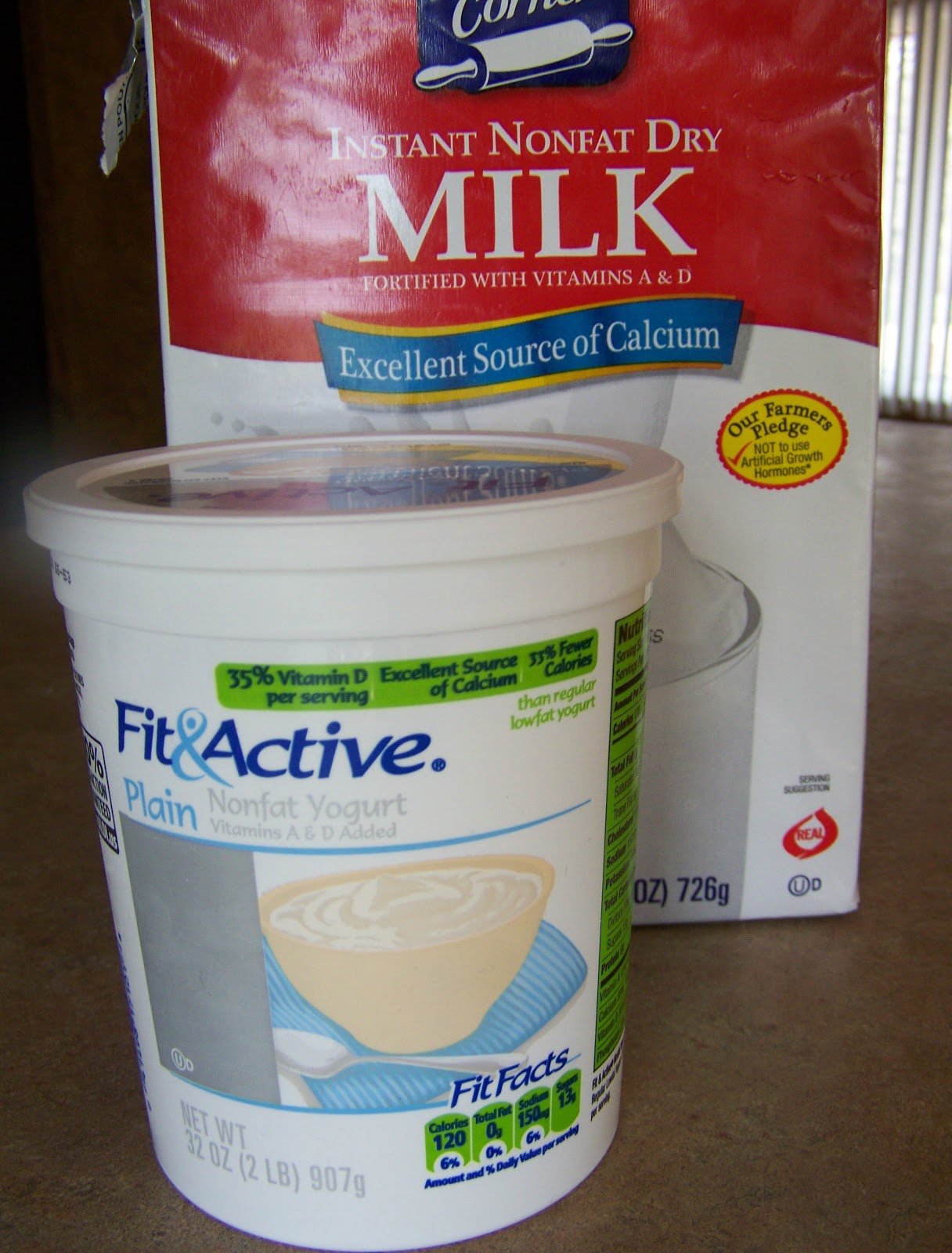 | For this easy recipe, you will need two ingredients, nonfat dry milk and plain yogurt with live cultures. Any brand should do, so long as it has live cultures. |