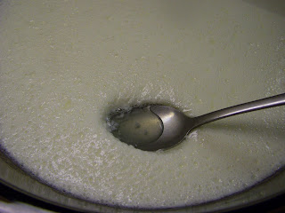 | This is what your yogurt will look like when it is done. The whey will seep out when a spoon is gently placed on the surface. To learn more about yogurt, cheese and butter, this is a good source - The Complete Guide to Making Cheese, Butter, and Yogurt at Home: Everything You Need to Know Explained Simply (Back to Basics Cooking) Update! I've had a reader ask if they could use this same process with regular milk (instead of powdered). I tried two variations ~ The first method 1) Use 6 cups of whole milk from the grocery store and allowed to warm to room temperature. 2) Add 3 Tbsp of yogurt to mix then follow directions as stated in recipe above. The results of the first method The finished product was definitely yogurt, however it was very much like kefir in consistency. It would be perfect for a smoothie or just to drink The second method 1) Heat 6 cups of whole milk from the store to steaming, allow to cool to 110 or so. 2) Add 3 Tbsp of yogurt to mix and follow directions as stated in original recipe The results of the second method The finished product was very thick and creamy. I am impressed! Still much easier than most yogurt recipes. As a side note, milk has been only $1.99 a gallon in our area. This is considerably less expensive than powered milk (approximately $3.50 per gallon for the Aldi brand). I will likely use regular milk until it becomes more expensive than the nonfat dried milk, simply of the cost.