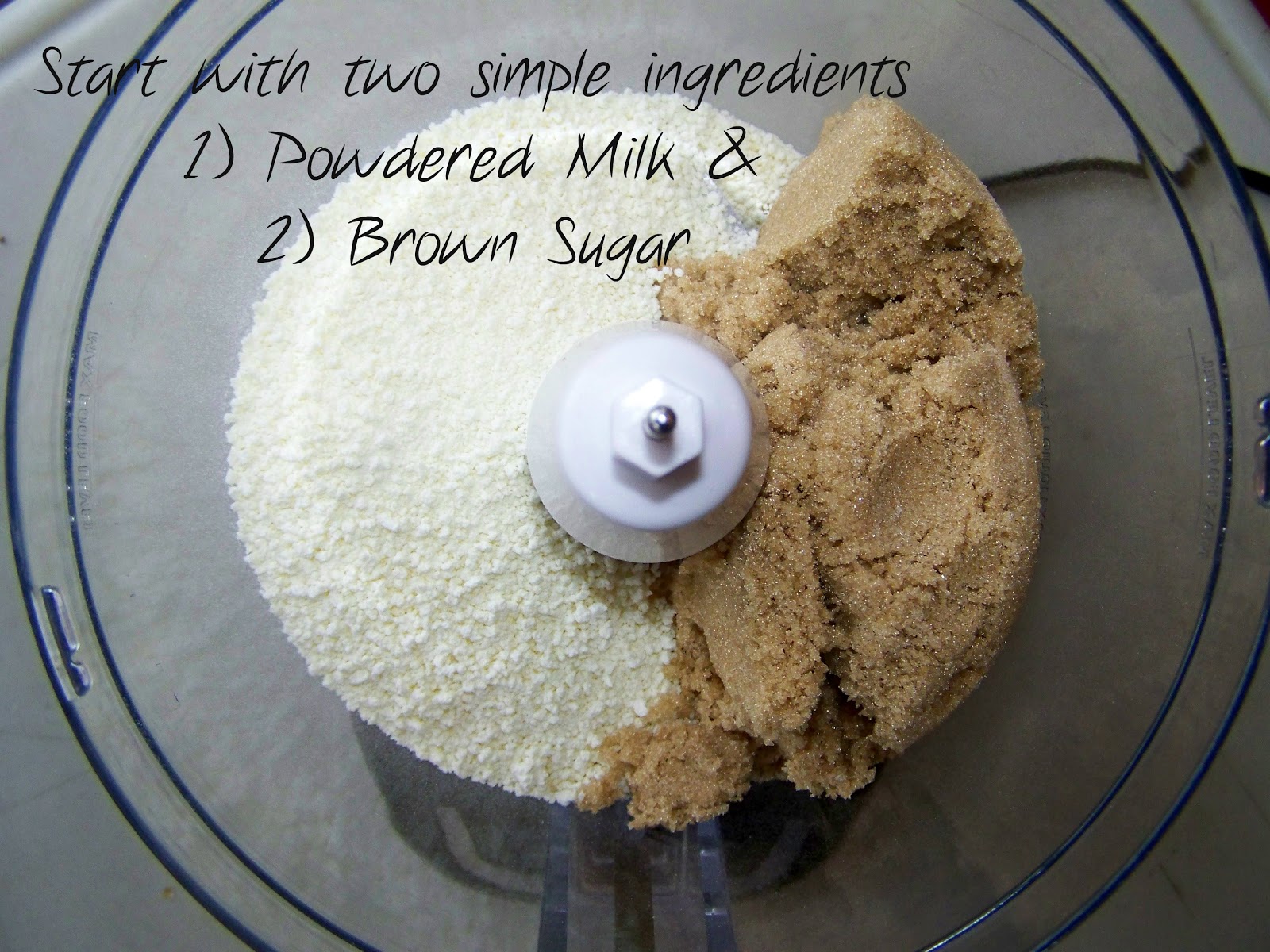| 1) Mix by hand or in your food processor 1 cup of brown sugar and 1/2 cup of powdered milk. Blend well. |