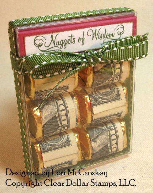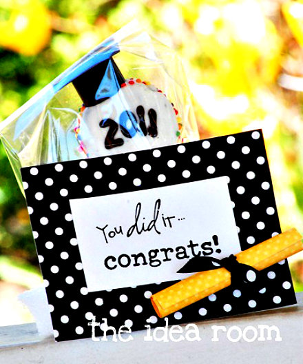 | The the idea room has step by step instructions on how to make these adorable treats. Not a money gift but still a really cute idea for those on a tight budget. I think this would be cool for a large group of graduates. (Think gifts from teacher or mentor.) |
