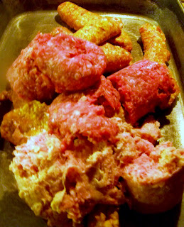 1) Brown over medium heat 1 lb ground turkey, 1 lb ground beef, and 2 lbs italian sausage. We like to use 1 lb hot italian sausage and 1 lb mild italian sausage. If your family prefers less spice, just use 2 lbs mild italian sausage. Do not cook the meat completely. It will finish cooking in the oven or crockpot.