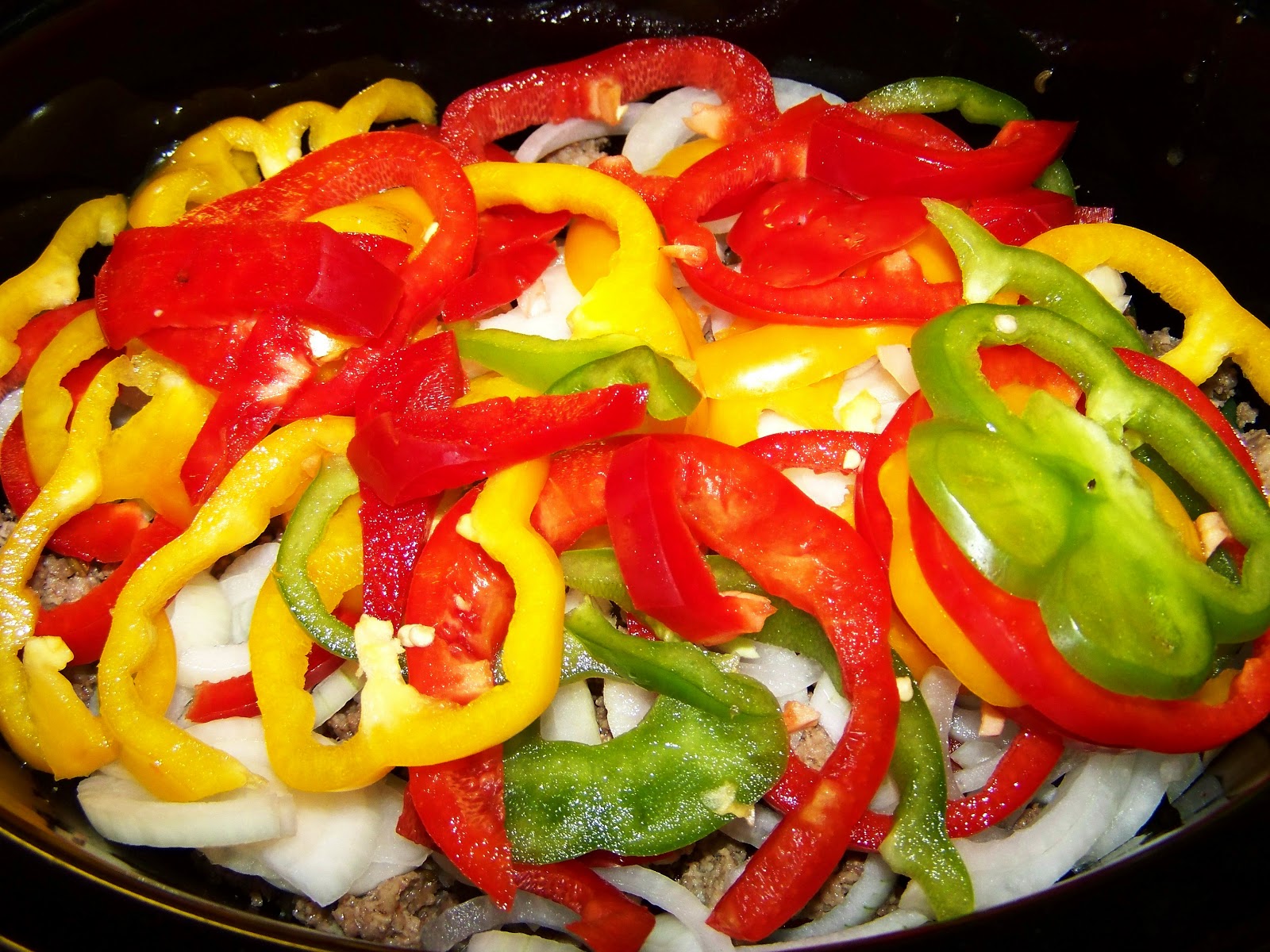 2) While the meat is browning, slice or dice 2 medium onions (white or yellow), 2 red bell peppers, 2 yellow bell peppers, 2 green bell peppers and 3 garlic cloves. You can substitute all green bell peppers if you can't find red or yellow. I've done this in a pinch but I do think it changes the flavor somewhat. |