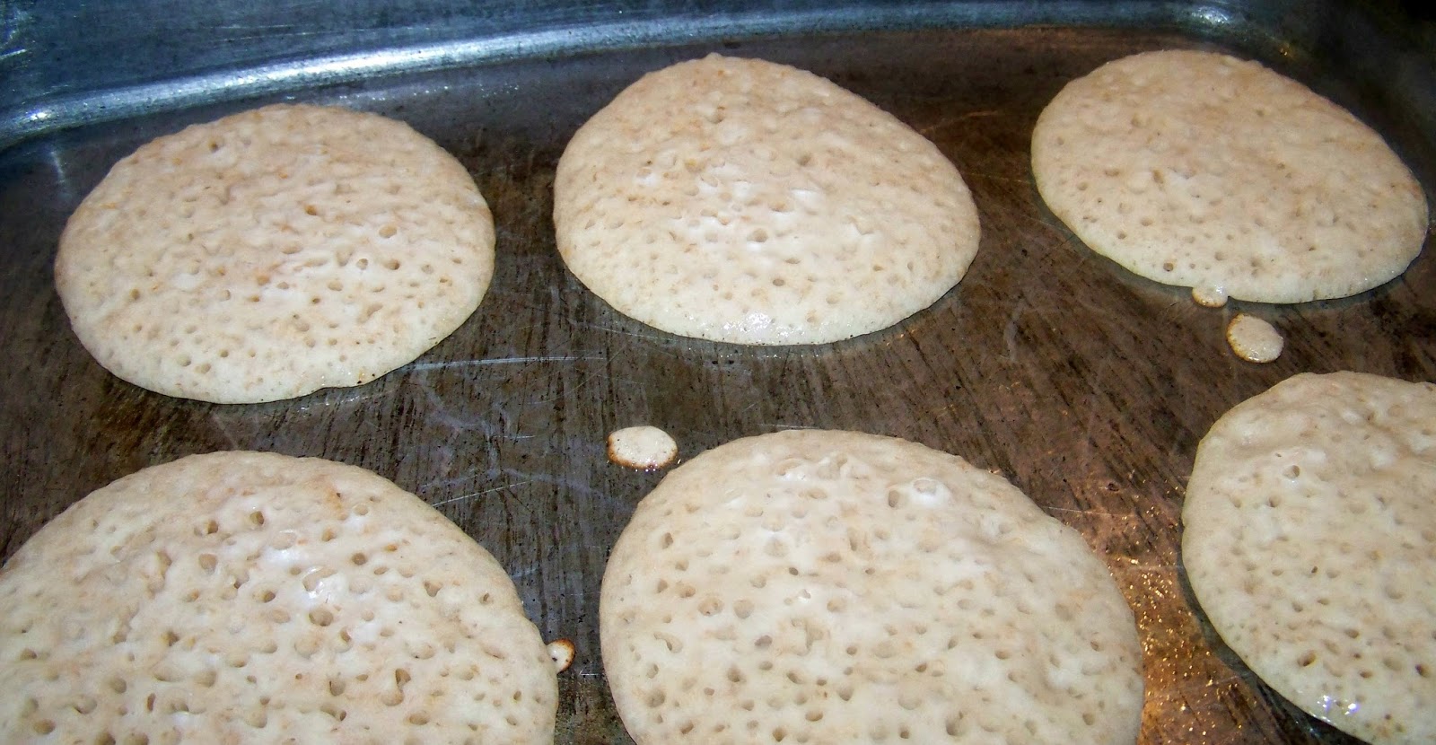 Heat pan or griddle to medium high heat. Grease well. I only grease the griddle once, but if yours isn't as old and seasoned as mine, you may have to grease often. Griddle is ready when water droplets dripped on it sizzle. Pour pancakes to your desired size. |