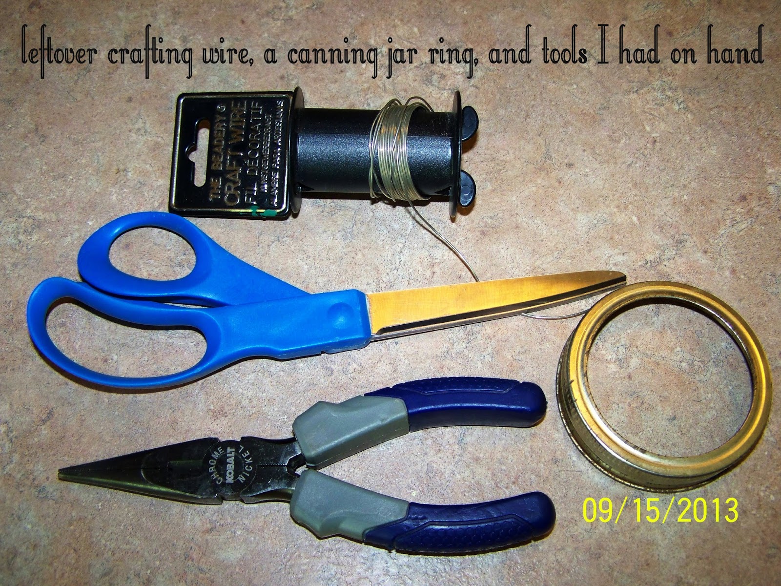 | I had leftover crafting wire from a Christmas project that I used to craft the top of my wind chime. A canning jar ring made a fine hoop to attach the strands of buttons to. |