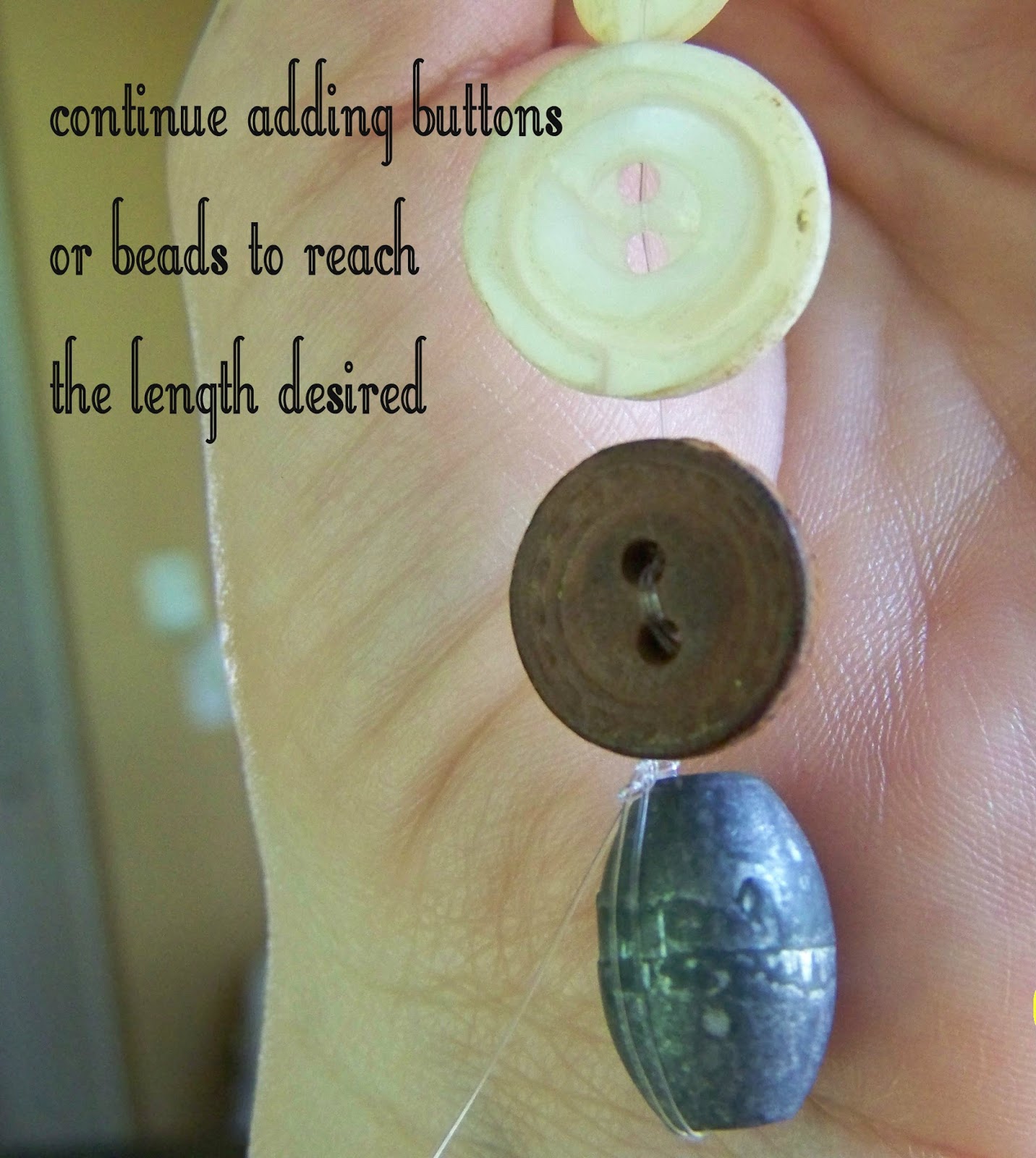 | I decided to use fishing line to string the buttons and sinkers to weight them down. |