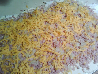4) Spread evenly a half pound to one pound of ground or finely chopped ham, diced onion (as little or as much as you like), and a cup or more shredded cheese.